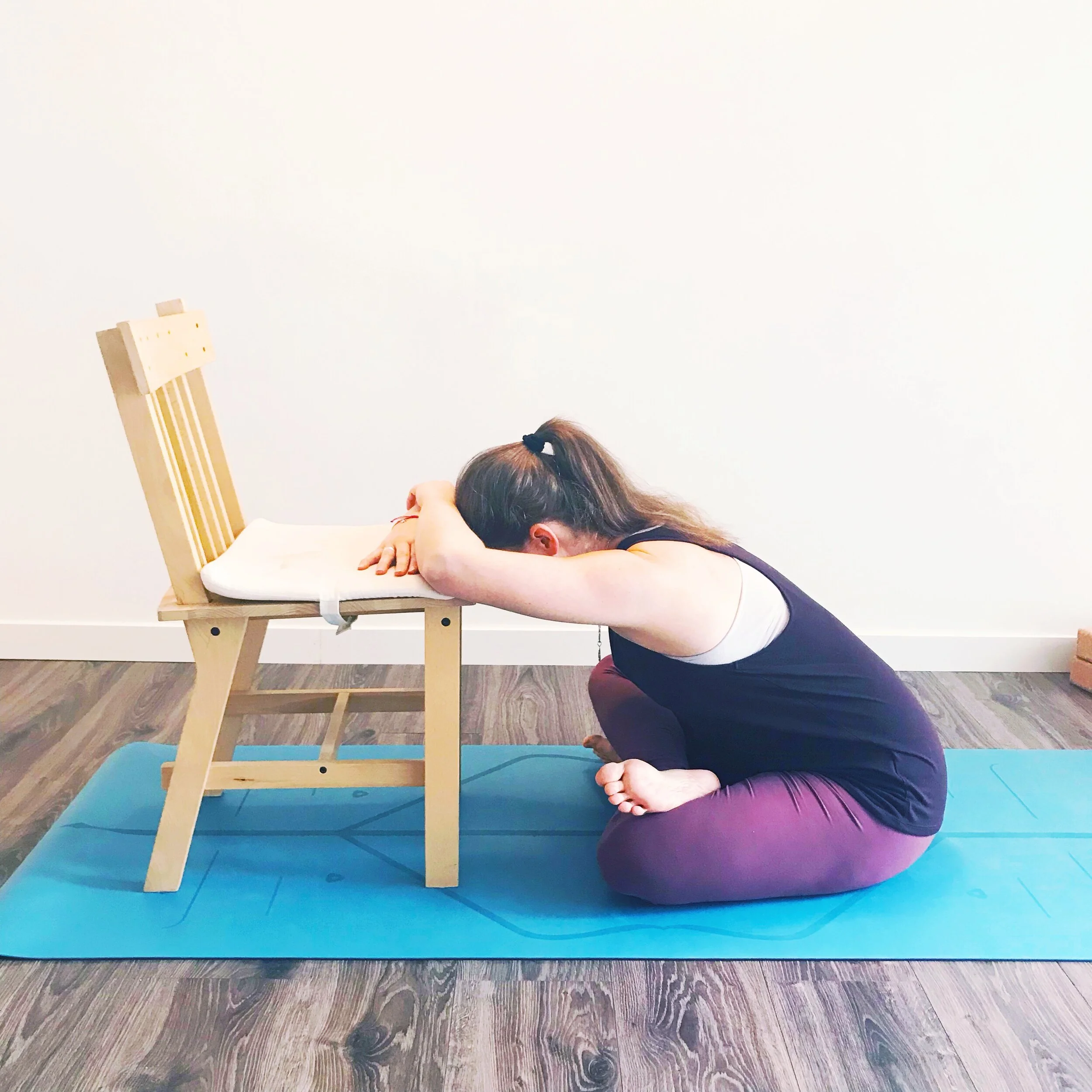 Agnistambhasana: the fire log pose with forward bending resting on a chair.