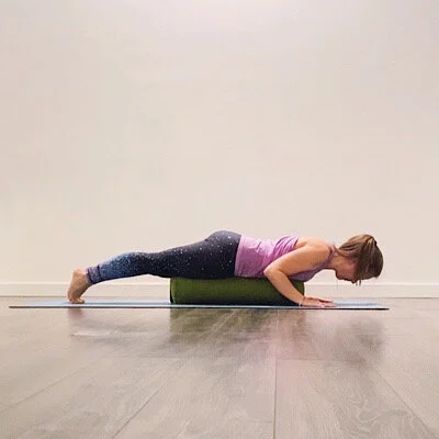 Les avantages? Ça raccourcit le moment où tes bras doivent supporter le poids du corps et, en plus, ça te permet de mieux prendre conscience de ton alignement dans la posture, puisque quand tu arrives sur le bolster, tu es dans la posture chaturanga parfaite: bassin et épaules alignés.