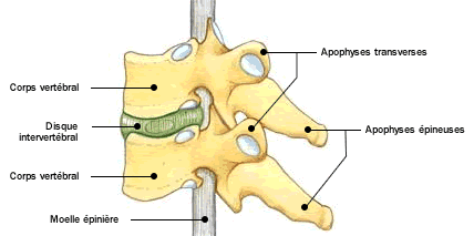 Entre chacune des vertèbres, sauf entre les 1ères cervicales (l'atlas et l'axis) et celles de la région pelvienne qui sont soudées, se trouve un disque, le disque intervertébral, qui entoure un noyau gélatineux: ce disque sert d'amortisseur aux mouvements de la colonne. Il donne aussi sa capacité de mobilité à la colonne.