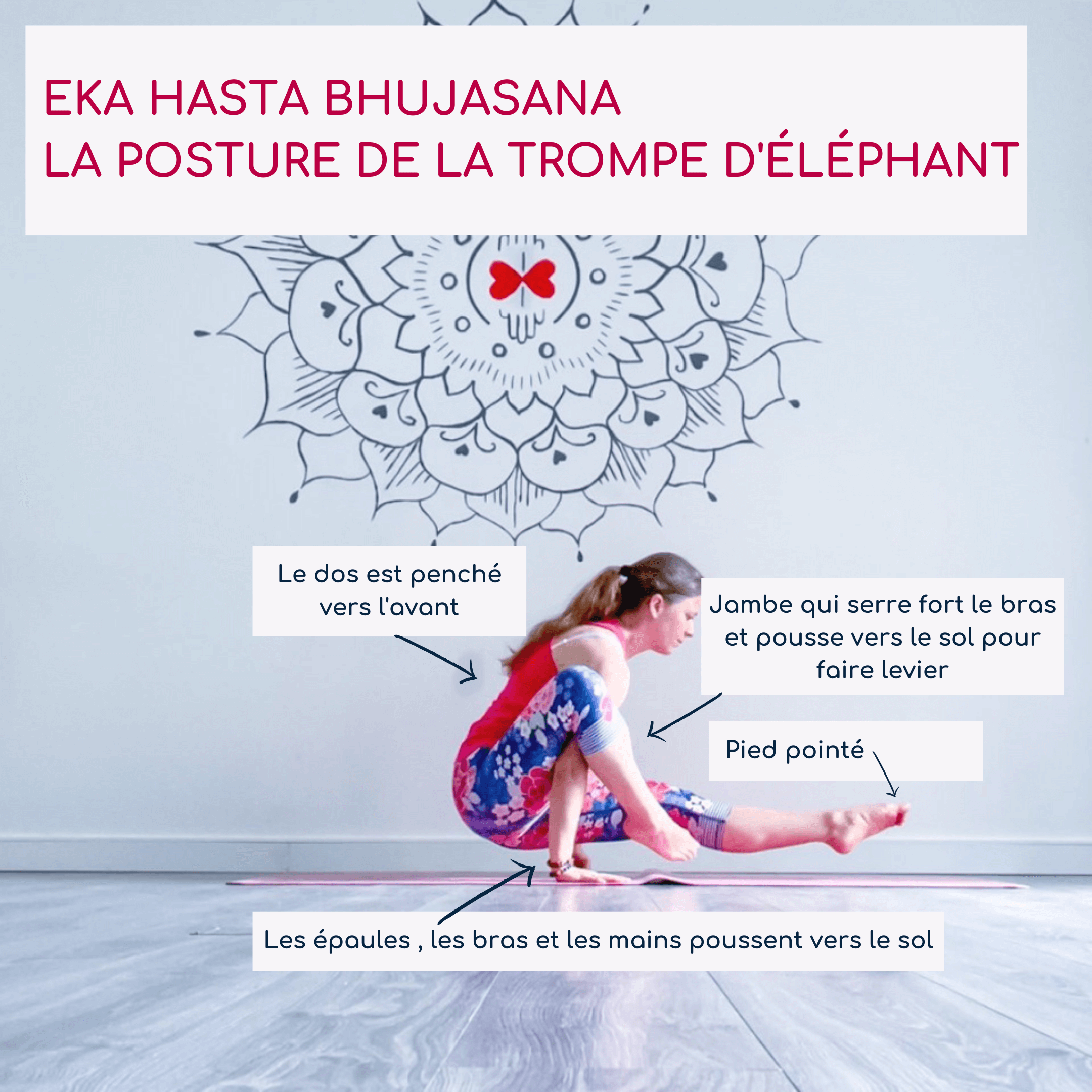 En yoga, la posture de la trompe d’éléphant, aussi appelée la posture de la jambe par-dessus l’épaule ou, en sanskrit, Eka Hasta Bhujasana, fait partie des postures d’équilibre sur les bras.