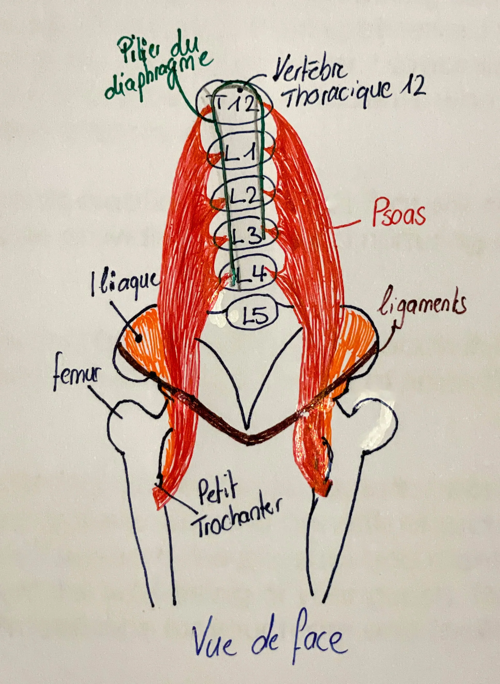 À noter: on parle en général du psoas, mais à l’origine, il y a le psoas mineur et le psoas majeur. Par contre, c’est un peu comme les dents de sagesse. Avec l’évolution, le psoas mineur a tendance à disparaître. Donc, certaines personnes n’ont qu’un psoas mineur ou n’en ont pas du tout.